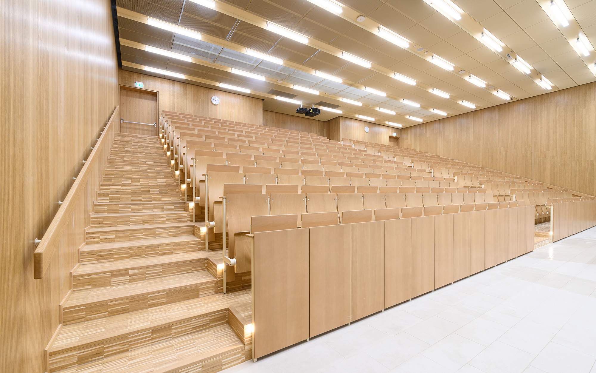 Die Modernisierungsarbeiten am Gebäude Chemie 4.3 an der Universität Saarbrücken umfassten die Renovierung der beiden Hörsäle (eines kleineren und eines größeren Hörsaals). Darüber hinaus wurden das Foyer sowie die notwendigen Versorgungseinrichtungen im unteren Geschoss, wie Technikräume und Sanitäranlagen, auf den neuesten Stand gebracht. Eine auffällige gestalterische Komponente war die Verwendung von Cortenstahl, der in Form einer Streckmetallverkleidung die beiden Hörsäle umgibt, während im Inneren des Hörsaals Holz verwendet wurde. Innerhalb dieser Verkleidung wurden speziell für die Studierenden neue Spinde eingerichtet, und zusätzlich wurde eine Informationstafel installiert, die zur besseren Orientierung und Kommunikation beiträgt.