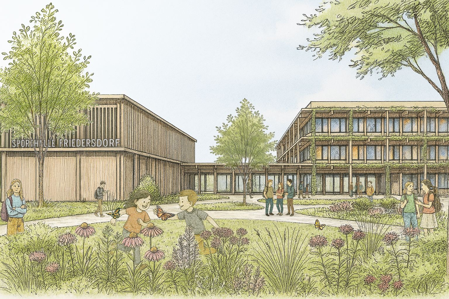 Die Schule wird so zu einem lebendigen Mittelpunkt des Ortsteils, der Lernen, Bewegung und Gemeinschaft selbstverständlich miteinander verbindet.